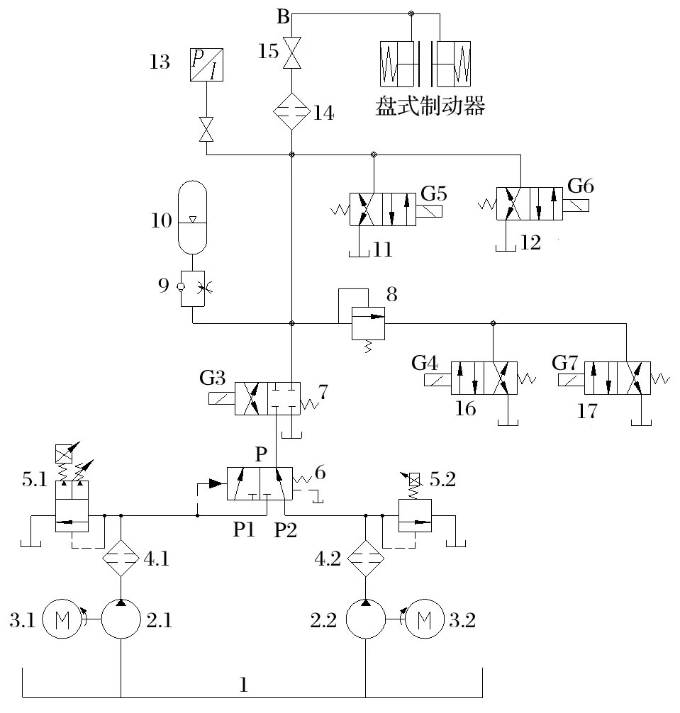 以中信重工生產(chǎn)的恒力矩安全制動(dòng)雙泵液壓站為例,其原理如圖1 所示。雙泵液壓站由油箱 1、互為備用的 2 套泵裝置、1 套共用的液壓閥組組成。其中,泵裝置由液壓泵 2、電動(dòng)機(jī) 3、過(guò)濾器 4、比例溢流閥 5 構(gòu)成;液壓閥組由液動(dòng)換向閥 6、電磁換向閥(7、11、12、16、17)、溢流閥 8、單向節(jié)流閥 9、蓄能器 10、壓力傳感器 13、過(guò)濾器 14、出油口球閥 15構(gòu)成。連接管路將液壓站出油口 B 和盤(pán)式制動(dòng)器連接。