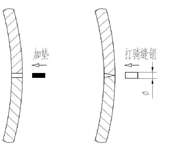 ①重 點(diǎn)檢查兩半卷筒的接合面部位是否出現(xiàn)縫隙。如果縫隙沿筒殼內(nèi)外均勻,則可以從外側(cè)向縫隙填補(bǔ)薄鋼板,并將其固定牢靠;如果縫隙沿筒殼內(nèi)外不均勻,一般是外側(cè)頂緊,造成貼緊的假象。可以從外側(cè)在接合縫部位打騎縫銷(xiāo)并可靠固定,將縫隙處撐緊。