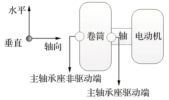 2.3 主軸承振動(dòng)測試方案 在提升機(jī)正常運(yùn)行下,利用測振儀器對電動(dòng)機(jī)和滾筒的連接主軸承進(jìn)行振動(dòng)檢測,經(jīng)過儀器自帶的軟件進(jìn)行頻譜分析后得到振動(dòng)頻譜圖,再與軸承的故障頻率進(jìn)行比對,從而判斷頻譜中是否存在軸承的故障頻率,進(jìn)而確定主軸承是否存在故障。主軸承振動(dòng)測試測點(diǎn)及方向如圖 1 所示。