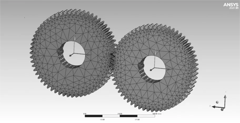 選用 ANSYS/Workbench 中的瞬態(tài)動力學(xué)模塊,對同步齒輪的嚙合過程繼續(xù)動態(tài)仿真分析。齒輪嚙合分析主要針對齒輪的接觸壓力以及zui大等效應(yīng)力特性。設(shè)置同步齒輪嚙合仿真時間為0.3s,選取28個齒面進行14對接觸,接觸類型為摩擦接觸,摩擦因數(shù)為0.2,法向剛度系數(shù)為1。根據(jù)同步齒輪的運動特性,確保齒輪只能繞 z 軸轉(zhuǎn)動。齒輪瞬態(tài)分析約束與載荷施加情況如圖8所示。