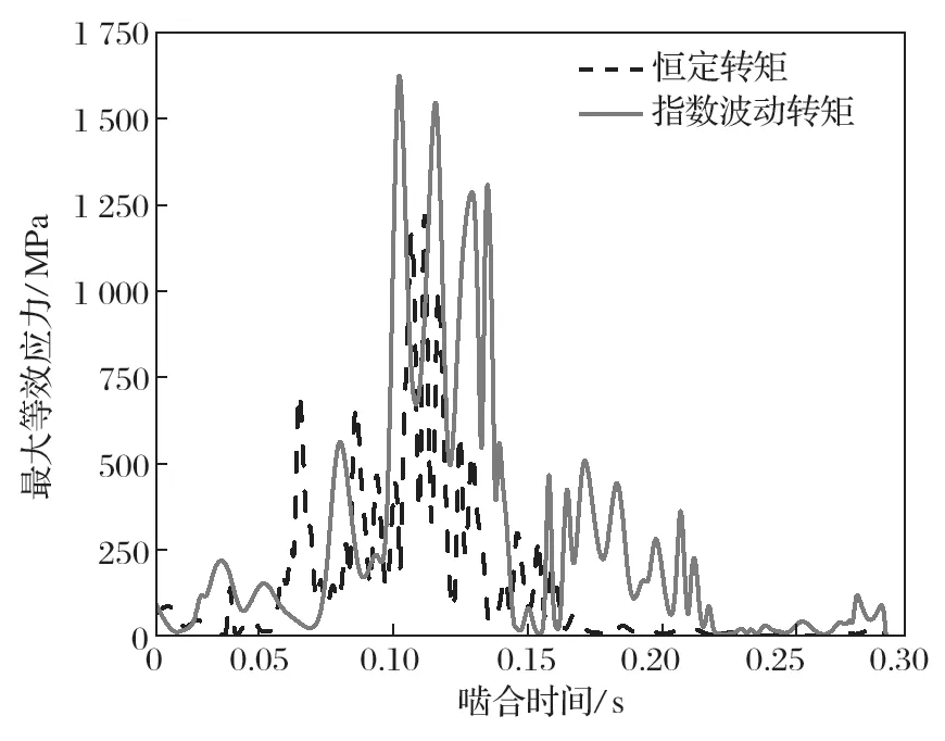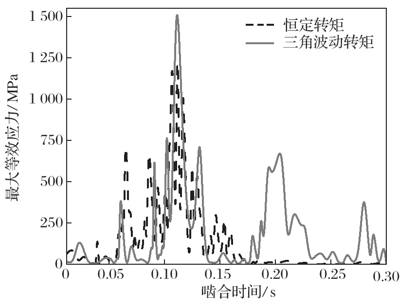 在有限元模型中,利用探針提取從動輪一個齒面與一個齒根面的zui大等效應(yīng)力。觀察恒定轉(zhuǎn)矩的zui大等效應(yīng)力變化,當(dāng)齒輪嚙合時間到達(dá)0.11s 時,位于從動輪齒面與齒根面的zui大等效應(yīng)力達(dá)到zui大,zui大等效應(yīng)力處于齒根處;應(yīng)力的變化趨勢整體呈現(xiàn)出金字塔形;隨著同步齒輪嚙合的進(jìn)行,zui大等效應(yīng)力的幅值逐步升高;達(dá)到zui高點(diǎn)之后,應(yīng)力幅值又逐步降低,表明嚙合過程的結(jié)束。因?yàn)辇X輪嚙合過程中是單齒對接觸與兩齒對接觸交替出現(xiàn)形式,所以會出現(xiàn)zui大等效應(yīng)力的波動。當(dāng)處于單齒對接觸時,應(yīng)力波動大,同時應(yīng)力值將達(dá)到zui大;在雙嚙合區(qū),其所受載荷與接觸壓力較平穩(wěn),受到?jīng)_擊較小,且應(yīng)力波動較小。