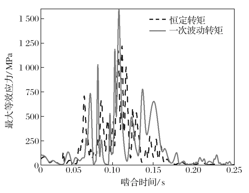 如圖12所示,一次波動轉(zhuǎn)矩的zui大等效應(yīng)力變化趨勢基本與恒定轉(zhuǎn)矩的zui大等效應(yīng)力變化趨勢一致,同樣是先增 大后減小;但是zui大等效應(yīng)力幅值變大,甚至超過了材料的屈服ji限。同時,由于一次波動轉(zhuǎn)矩的輸出,即使位于雙嚙合區(qū)時,其應(yīng)力波動相較于恒定轉(zhuǎn)矩輸出時的應(yīng)力波動也是更大。
