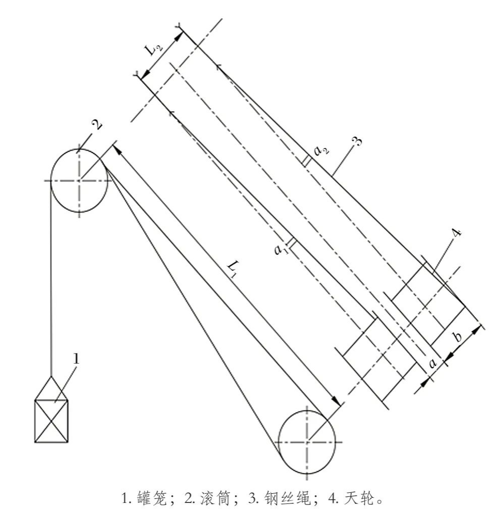 面對此種狀況,需對鋼絲繩天輪偏角進行調(diào)整,調(diào)整方法諸多,一種方法是更換天輪襯墊,以減少鋼絲繩對天輪輪緣的磨損,但隨使用時間的延長,襯墊磨損亦會加劇,鋼絲繩終將再度產(chǎn)生干涉;另一方法為調(diào)整滾筒的水平位置,使?jié)L筒整體平移,將原基礎拆除并重新施工,但工程量大且耗時費力。